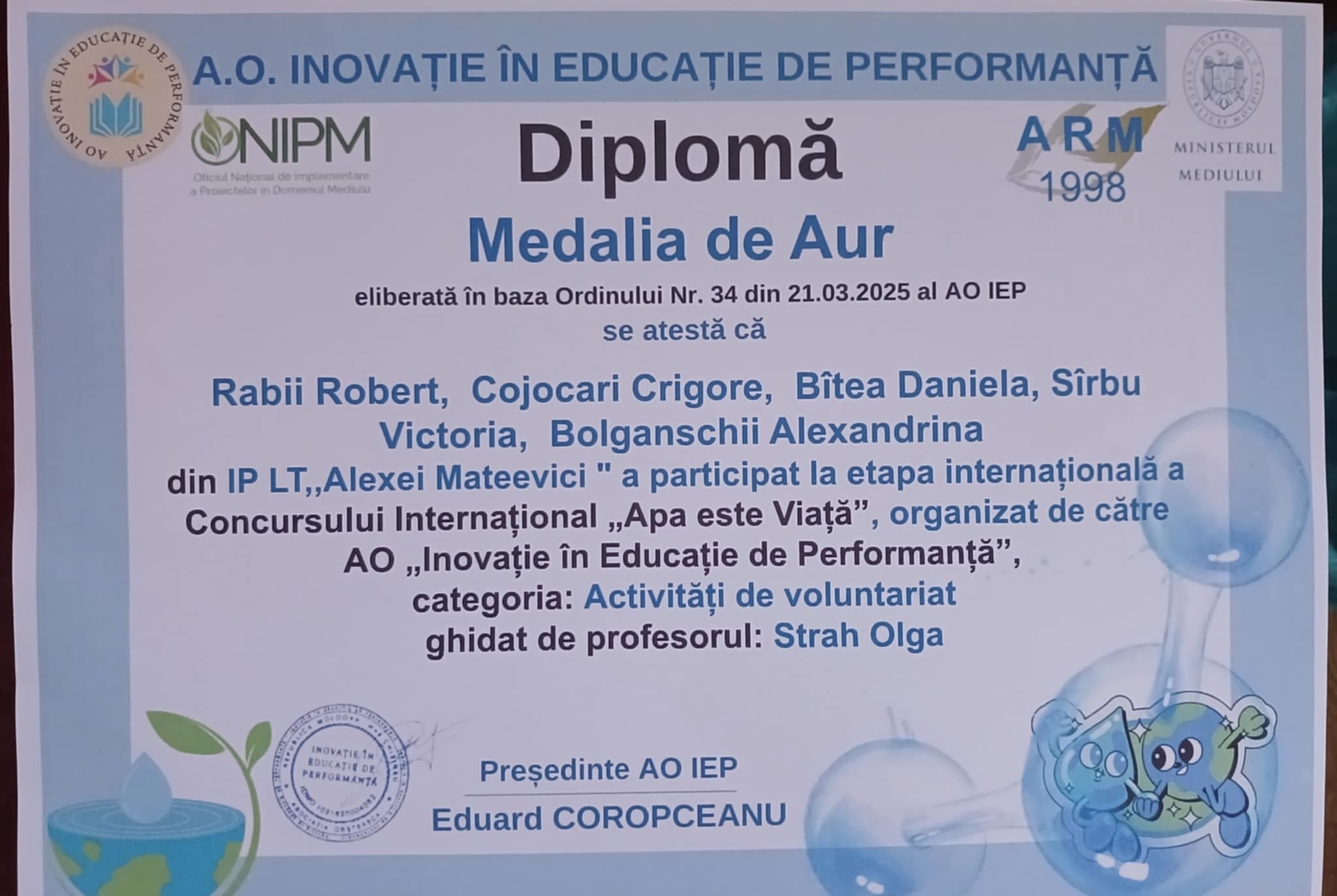 La etapa Internațională a Concursului „Apa este viață” grupul de elevi au câștigat Medalia de Aur.