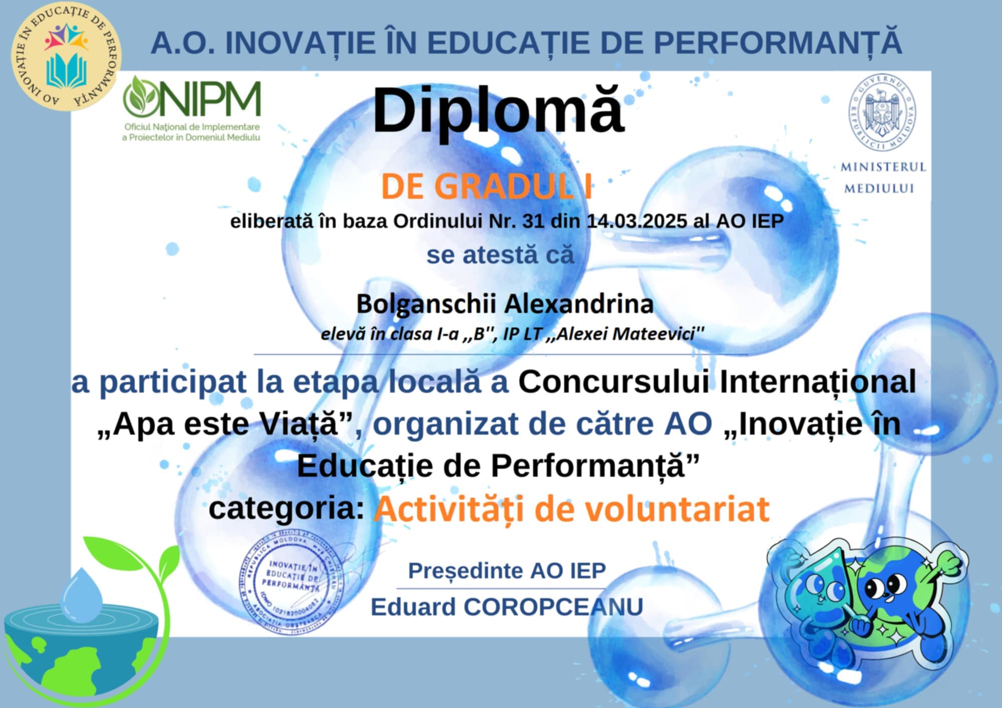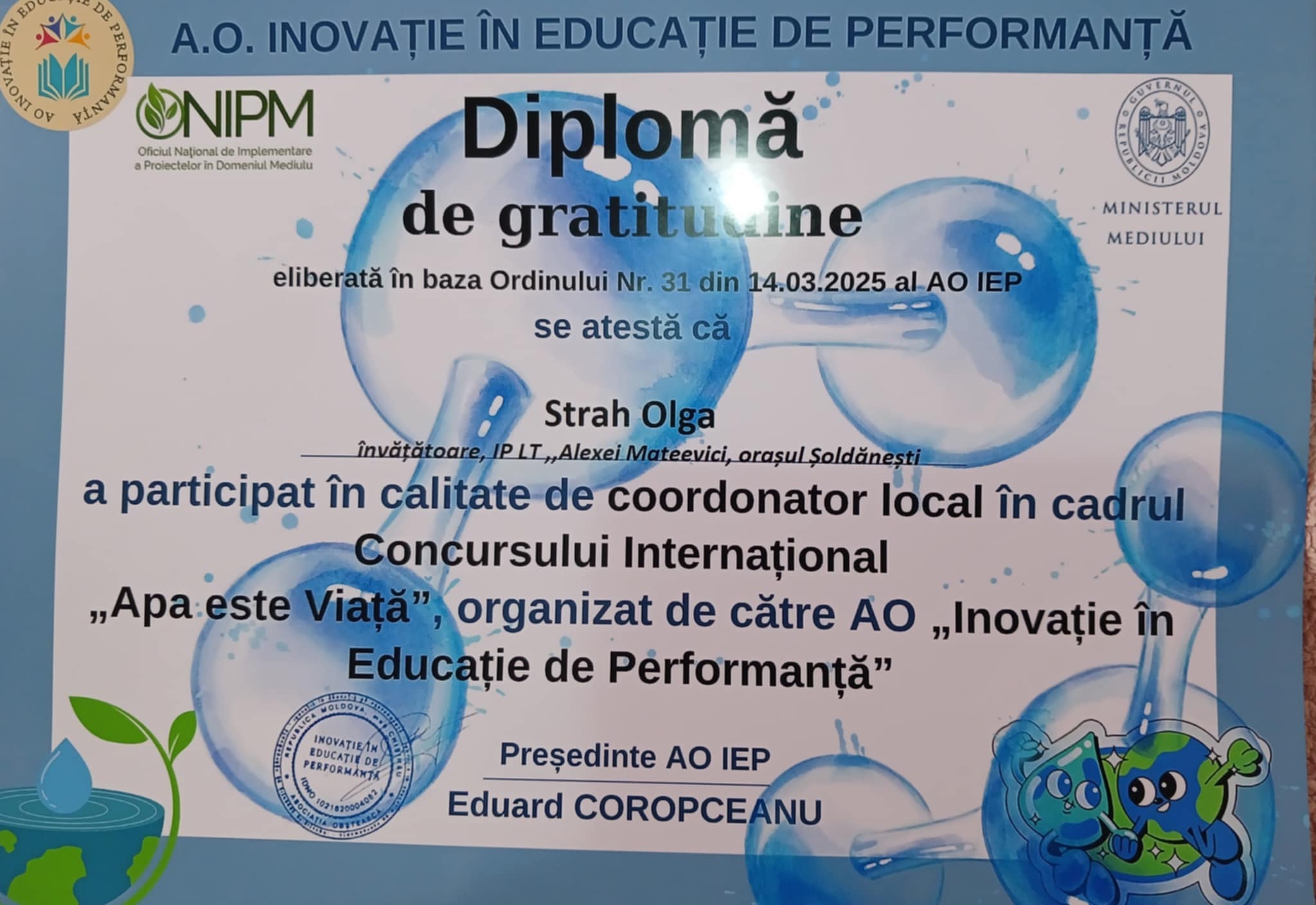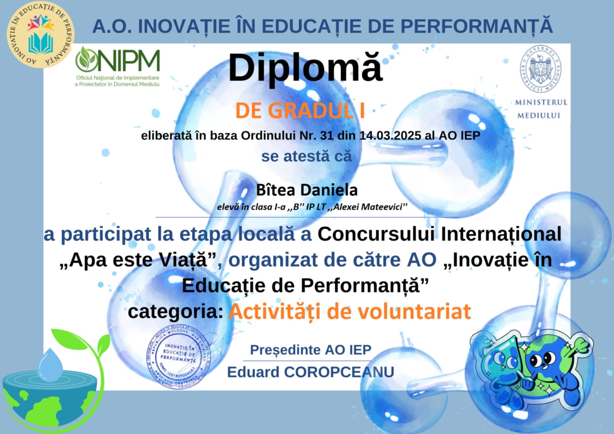 Felicităm câștigătorii Concursului INTERNAȚIONAL „Apa este viață” Categoria: „Activități de voluntariat”