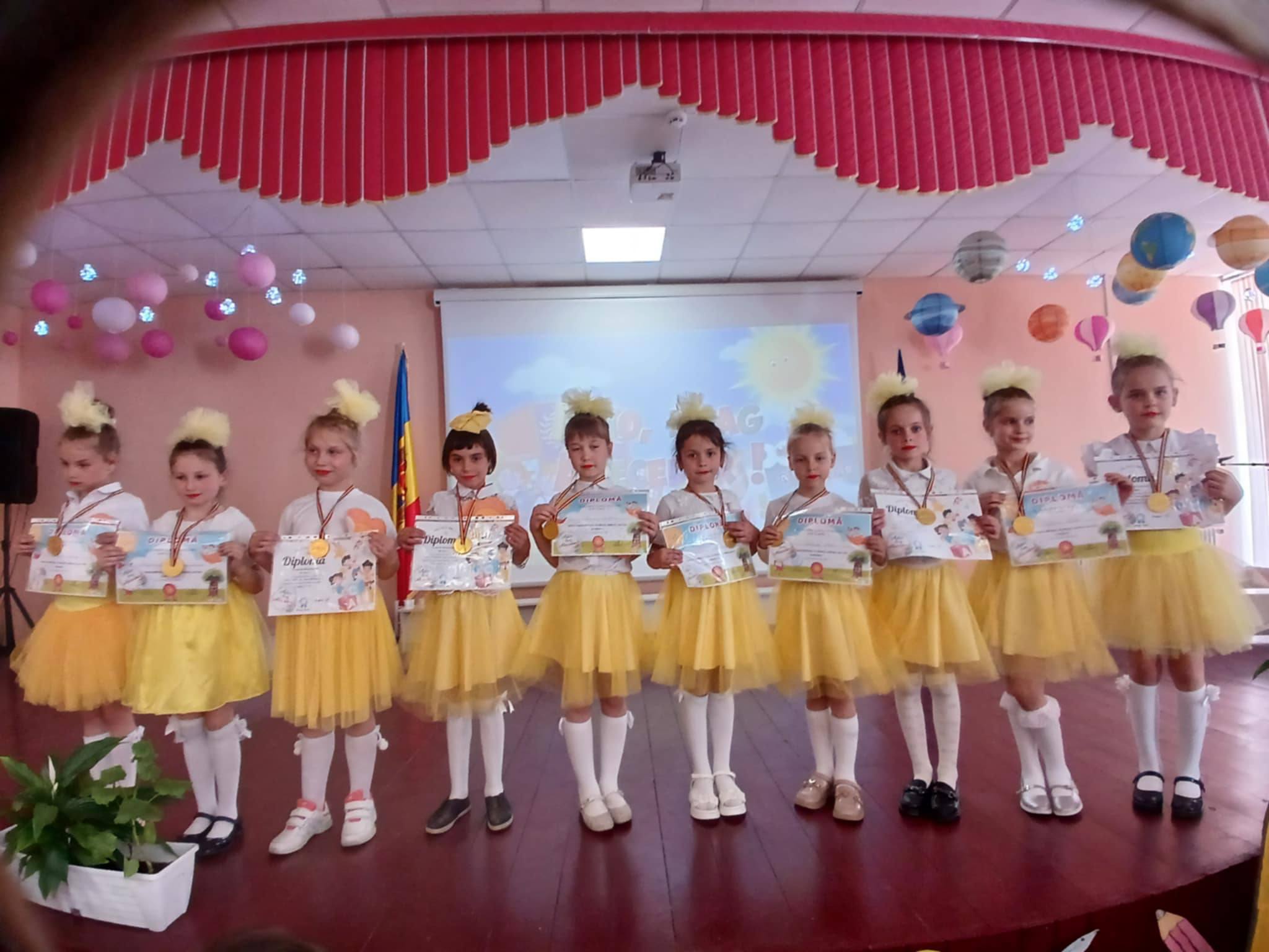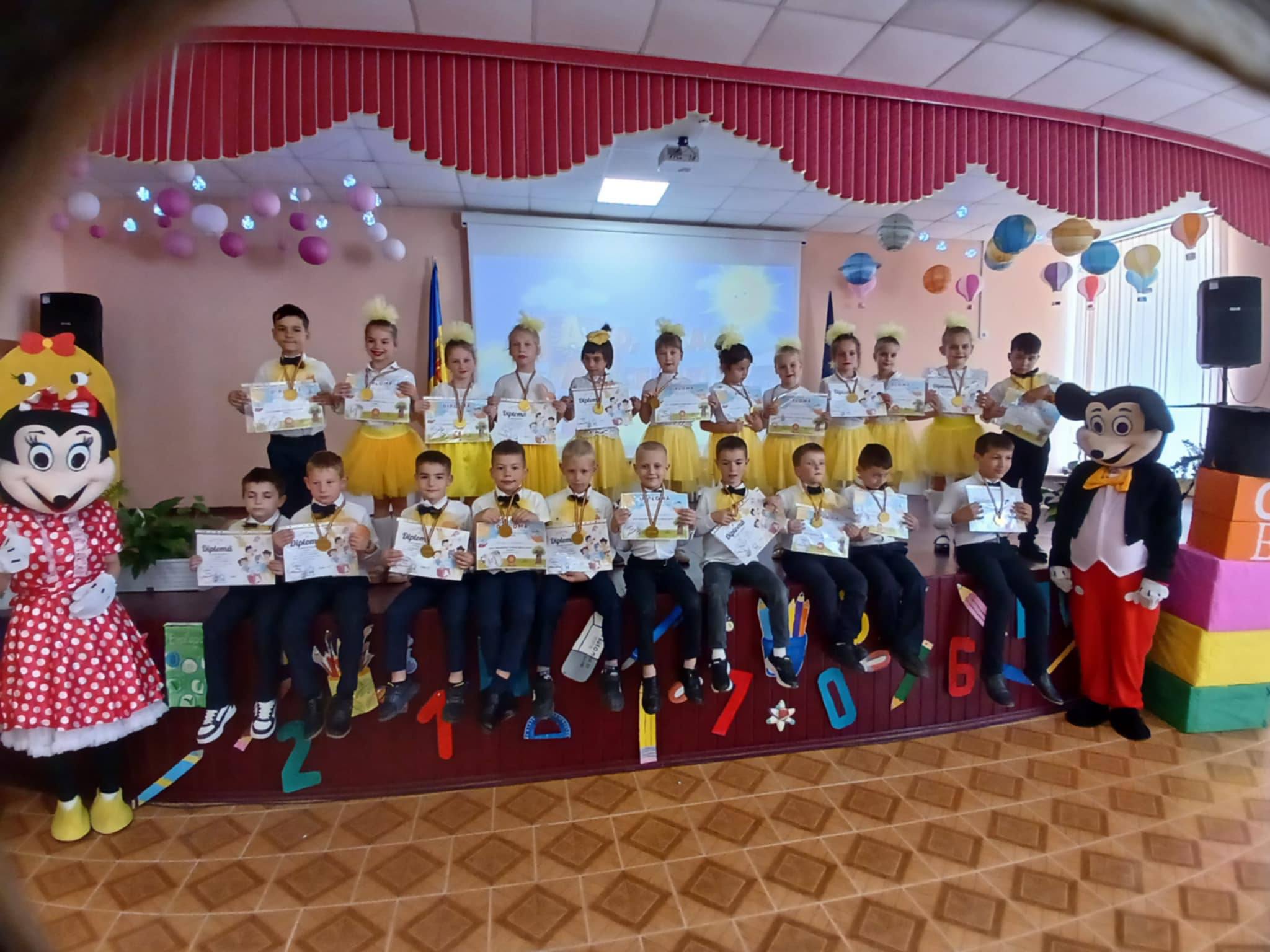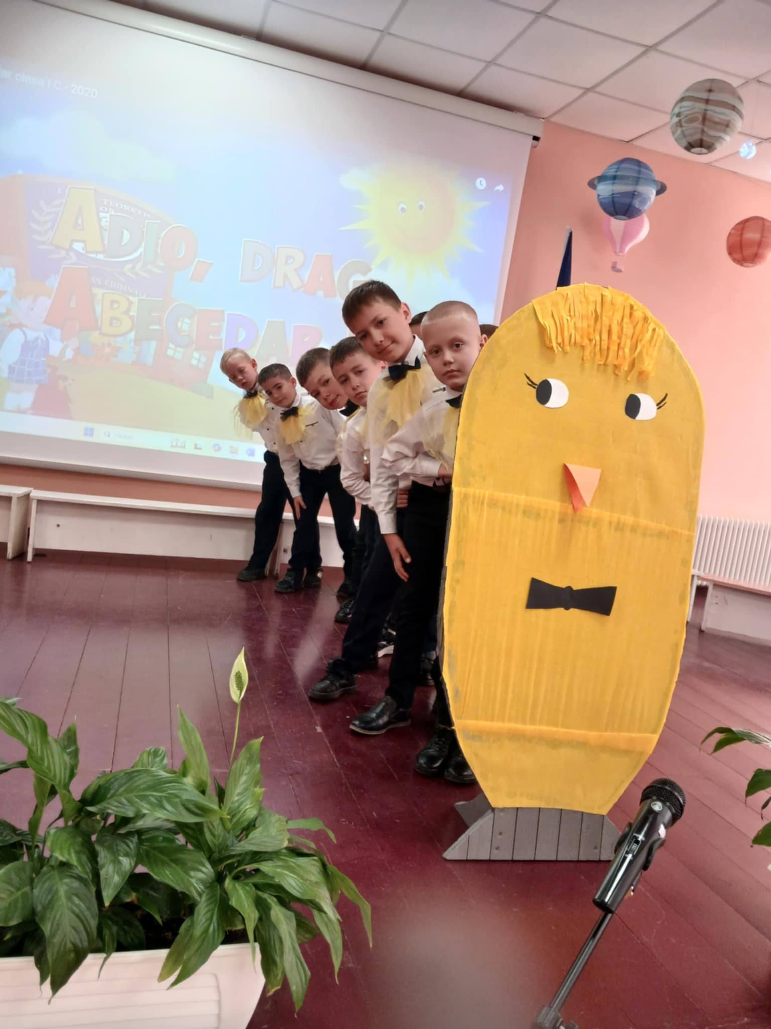 Micuții din clasa I-a ,,B” sunt fericiți că au ajuns la sfârșitul primului an de școală și au făcut o demonstrație de talente la ceremonia de încheiere a anului de studii.