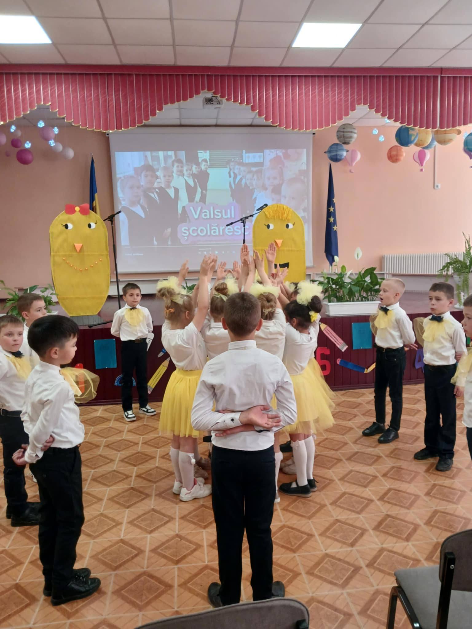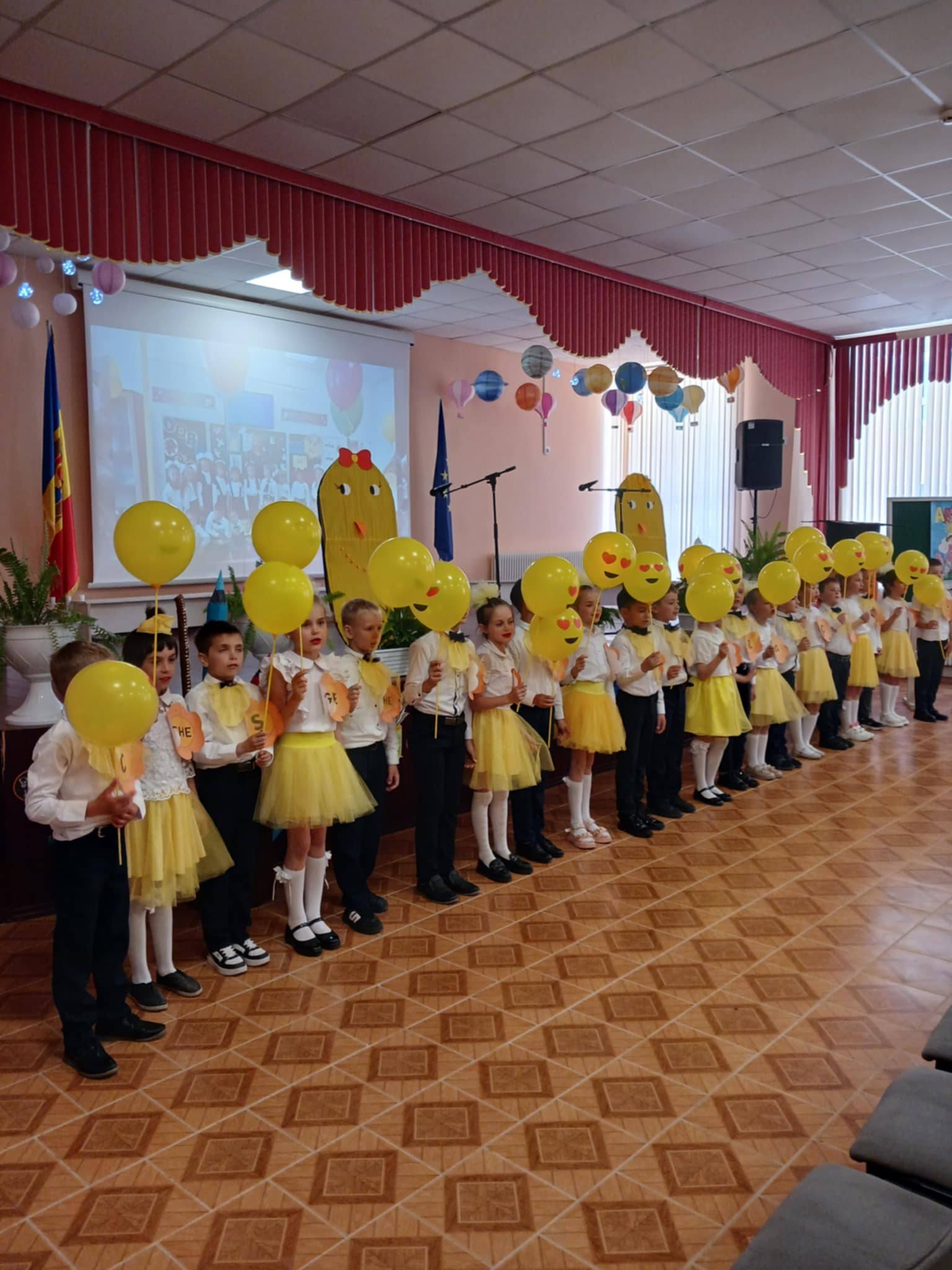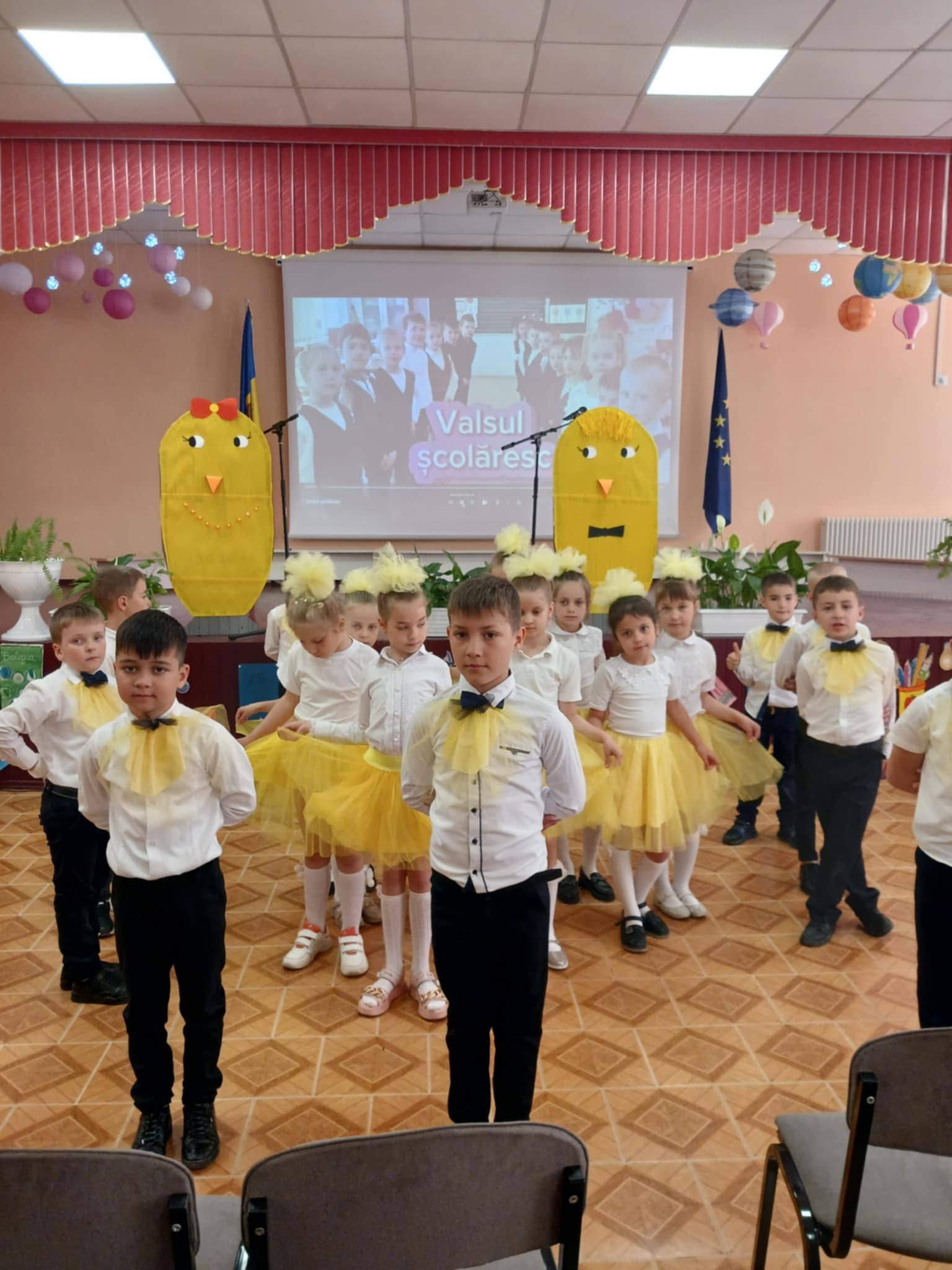 Micuții din clasa I-a ,,B” sunt fericiți că au ajuns la sfârșitul primului an de școală și au făcut o demonstrație de talente la ceremonia de încheiere a anului de studii.